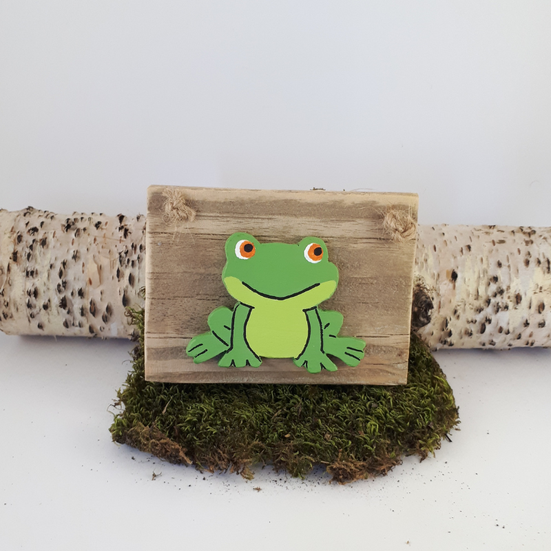 Rainette verte en bois peint, sur bois de palette à suspendre