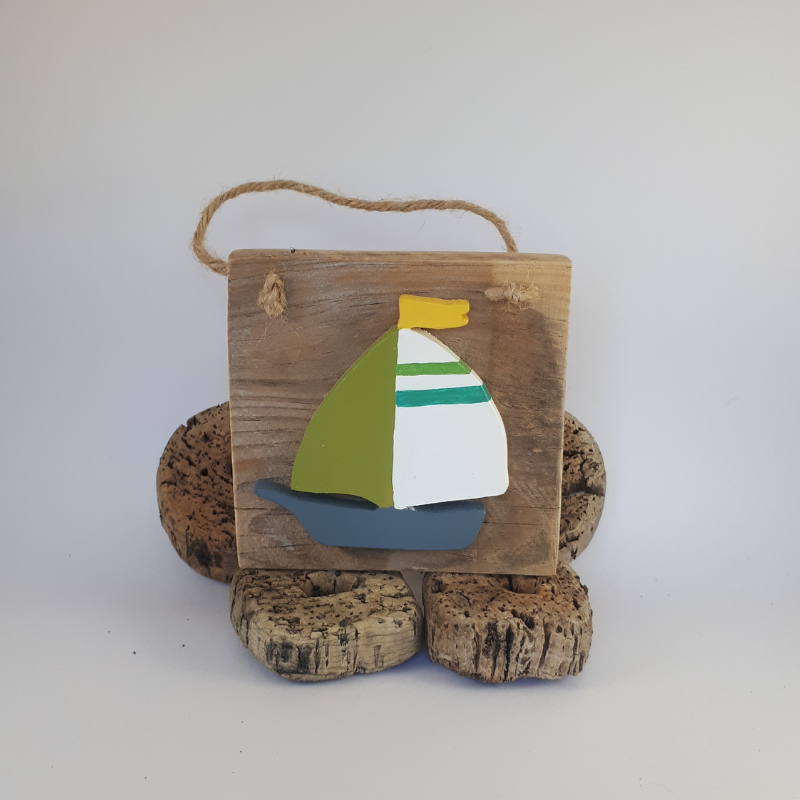 Bateau à voile en bois peint, sur bois de palette à suspendre'