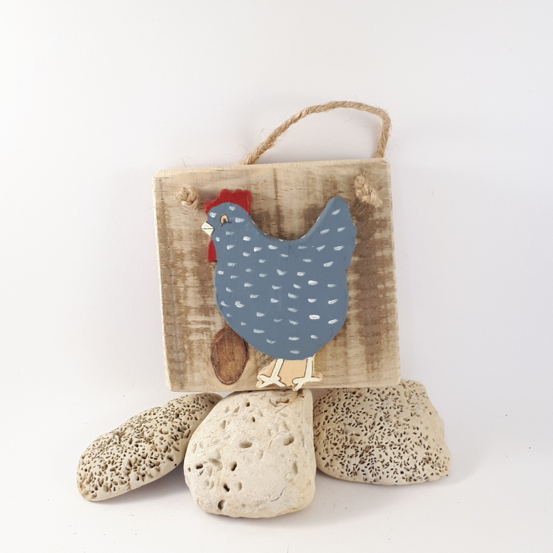 Découpée dans du bois de caisse de vin ou autre bois non traité, récupéré dans la grande distribution à l'aide d'une scie à chantourner, la poule est ensuite peinte et poncée plusieurs fois par mes soins. J'assemble sur un morceau de palette, à suspendre grâce à la cordelette en lin, les poules se déclinent en plusieurs teintes: rousse, blanche, grise clair, bleu gris, à pois ou noire.