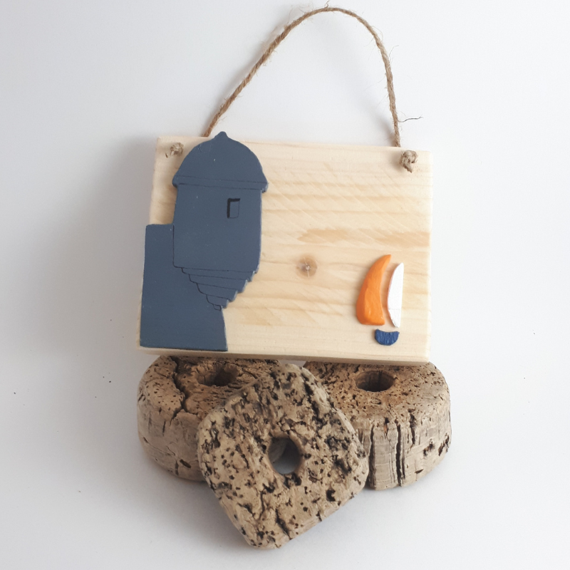 Sortie de Rade, l'échauguette et le voilier, sur bois de palette à suspendre