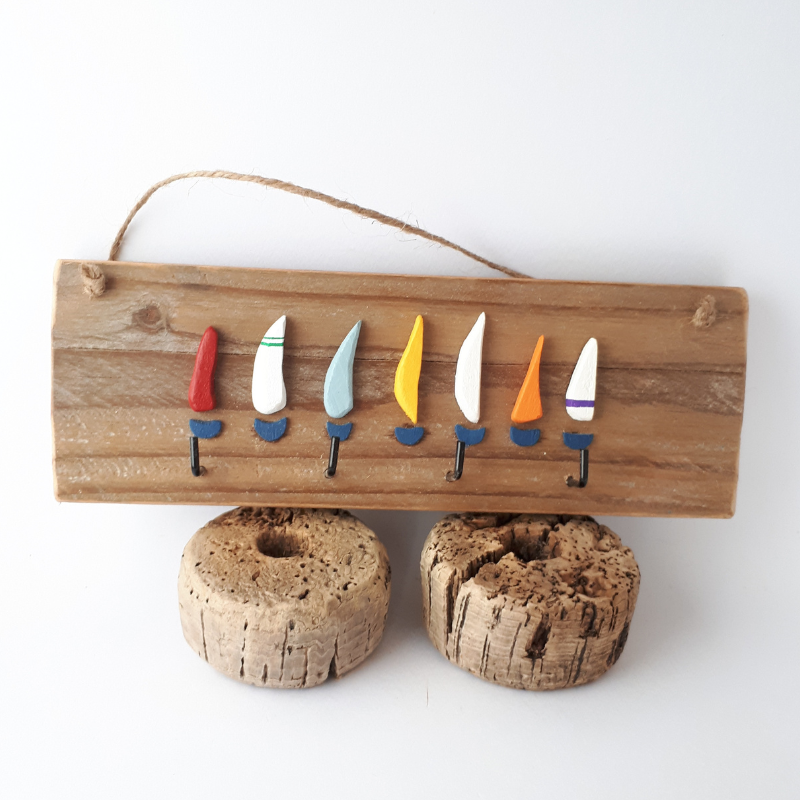 Régate 8 voiles en bois peint avec crochets, sur bois de palette à suspendre