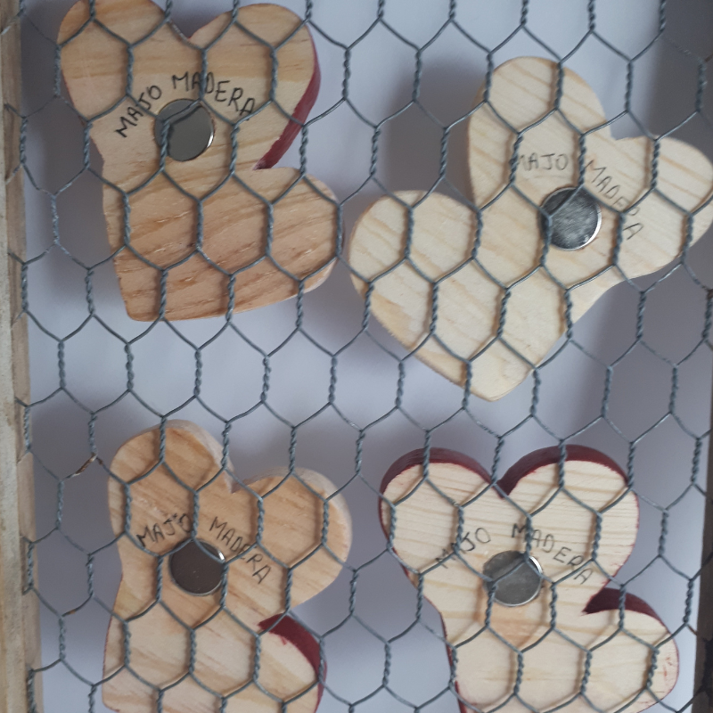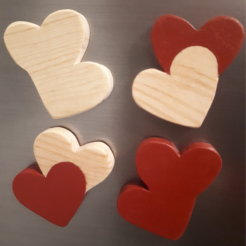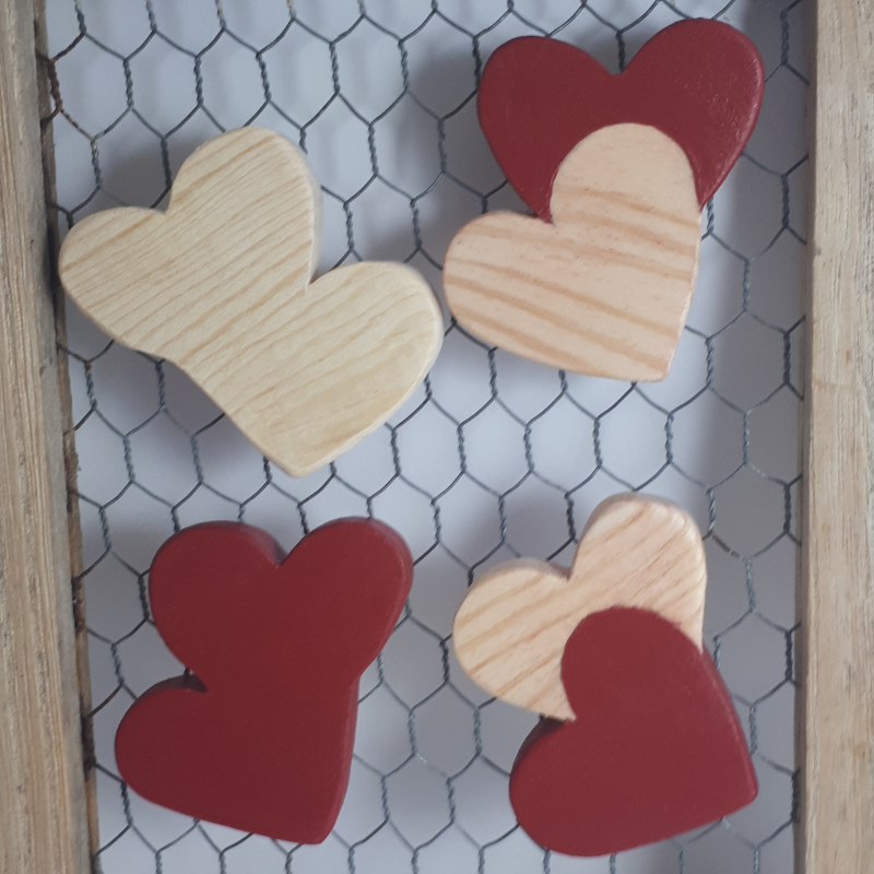 2 coeurs imbriqués, tantôt en bois naturel laissant apparaître les jolies nervures du bois, tantôt peints en rouge. A installer sur le réfrigérateur ou autre support métallique, comme un doux rappel chaque matin au réveil... Le bois est percé de l'épaisseur de l'aimant, ce dernier est collé au bois.